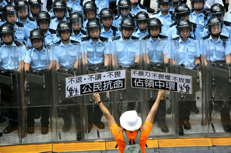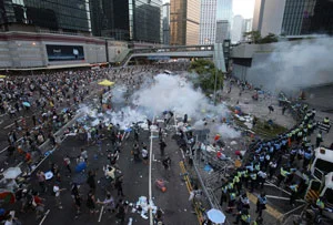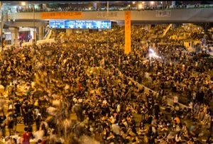 Grupos de estudiantes exigen libertad de voto en la ciudad controlada por China a través de manifestaciones generalmente pacíficas, en el denominado "Movimiento Paraguas".