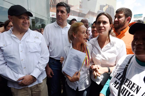 Junto a él están Leopoldo López, encarcelado a la espera de juicio, y María Corina Machado, a quien las autoridades venezolanas le impidieron volver a la Asamblea Nacional después de haber aceptado ser representante alterna de Panamá en la Organización de Estados Americanos (OEA).