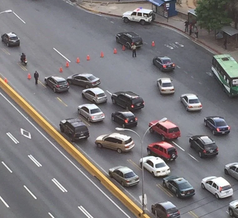 Con conos y barreras de protección vial, los efectivos obstaculizan el libre tránsito al reducir de cuatro canales a uno solo como sucede en la autopista Gran Mariscal de Ayacucho