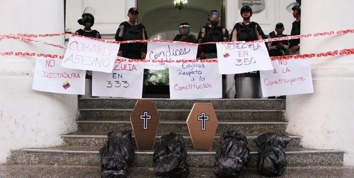 “Cómplices de la dictadura”, “350 ya” y “No a la constituyente” eran algunos de los mensajes que madrugaron a la entidad gubernamental como protesta en contra de la “dictadura de Nicolás Maduro y de Arias Cárdenas” por su responsabilidad en las más de 80 muertes de la represión en Venezuela.
