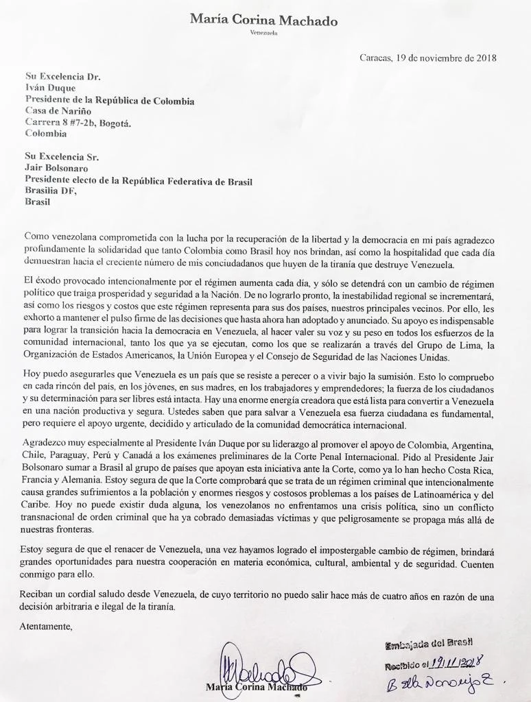 “Pido al Presidente Jair Bolsonaro sumar a Brasil al grupo de países que apoyan esta iniciativa ante la Corte, como ya lo han hecho Costa Rica, Francia, Alemania y la Unión Europea. Estoy segura de que la Corte comprobará que se trata de un régimen criminal que intencionalmente causa grandes sufrimientos a su población y enormes riesgos y costosos problemas a los países de Latinoamérica y del Caribe”, reza el documento.