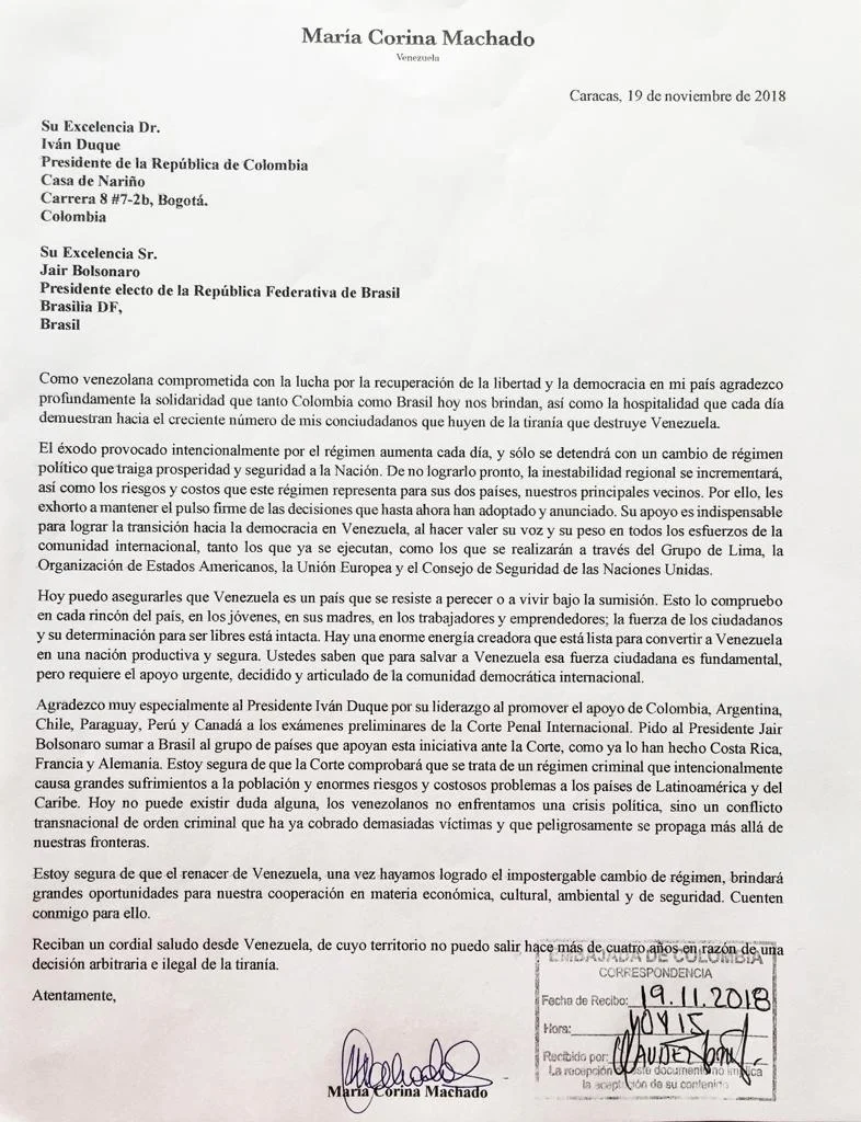 María Corina Machado envió este lunes la tercera carta dirigida a líderes mundiales. En esta misiva, escribió a los presidentes de Colombia, Iván Duque, y Brasil, Jair Bolsonaro, para agradecerles por su solidaridad con los venezolanos que han huido de la tiranía venezolana, así como las decisiones que han tomado respecto a nuestro país. Sobre estas últimas, les exhortó a mantenerse firmes y a ejercer presión con la iniciativa ante la Corte Penal Internacional contra el régimen venezolano, de la cual aún Brasil no forma parte.