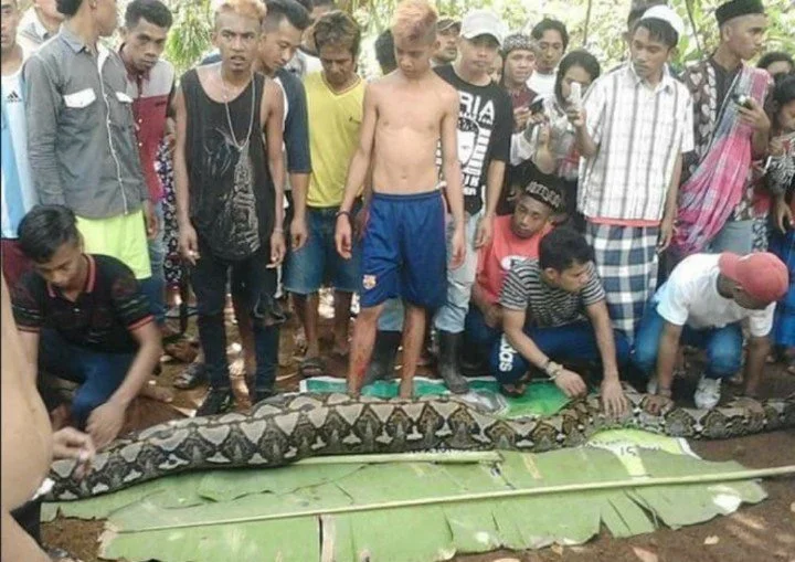 Algunos videos publicados en internet mostraban a los aldeanos cortando el cadáver de la pitón para revelar el cuerpo de la mujer.