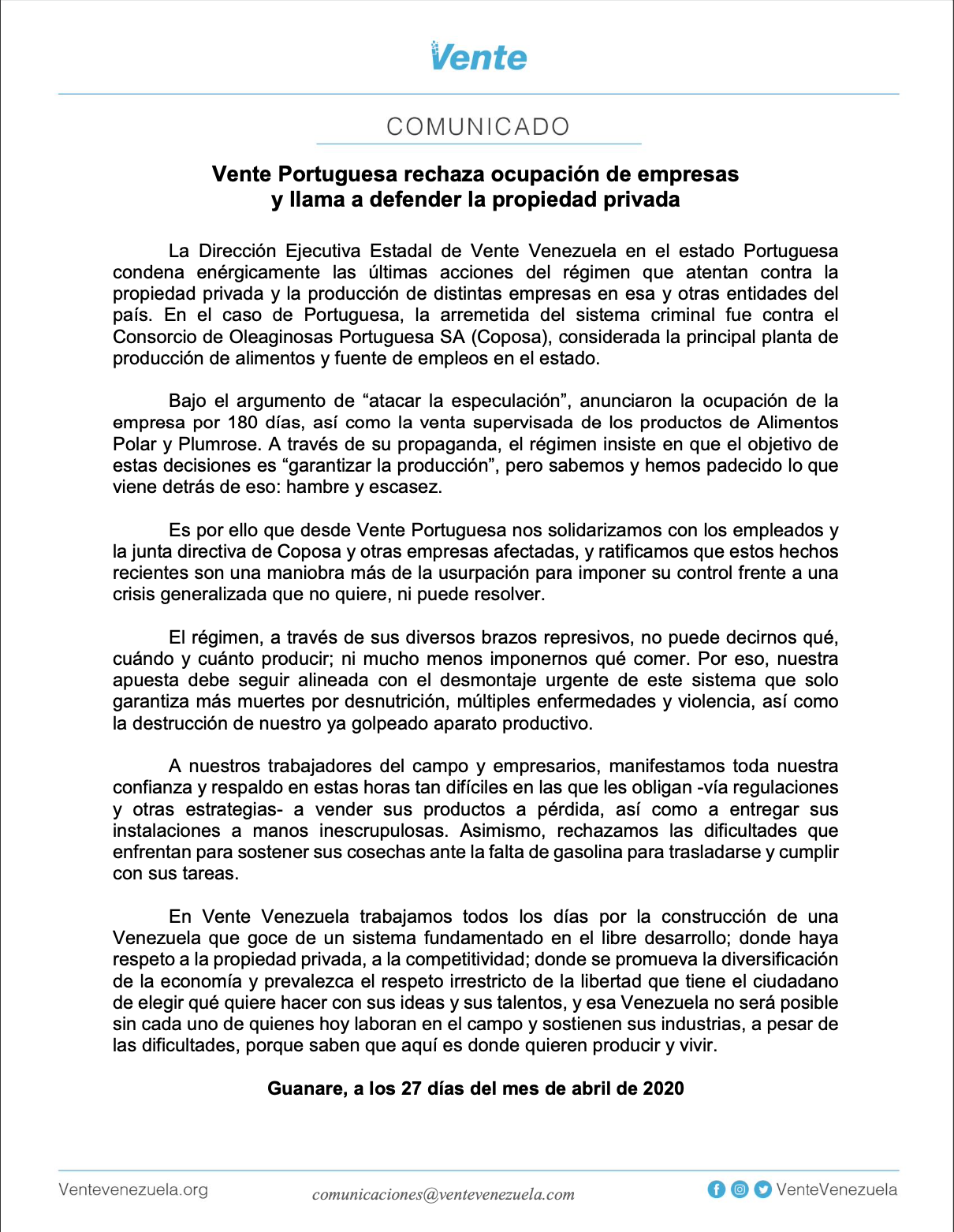 (Guanare. 27/04/2020) A través de un comunicado, el equipo de Vente Portuguesa fijó posición sobre la reciente ocupación de la empresa Coposa, en esa entidad llanera, y las últimas acciones del régimen contra la propiedad privada.