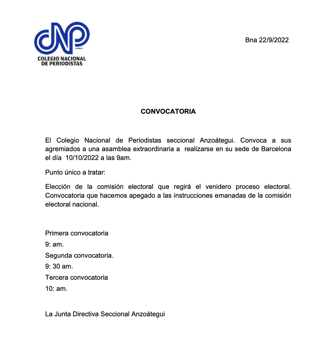 El Colegio Nacional de Periodistas seccional Anzoátegui. Convoca a sus agremiados a una asamblea extraordinaria a realizarse en su sede de Barcelona el día 10/10/2022 a las 9am.